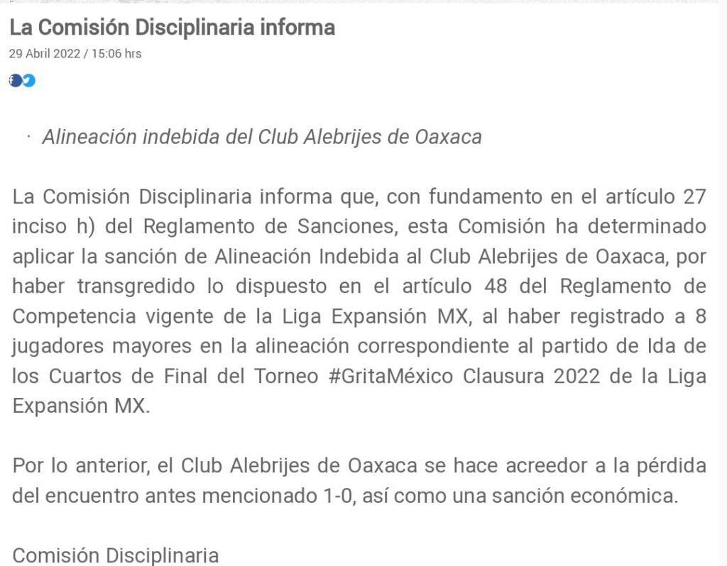 La Federación Mexicana de Futbol (FMF) resolvió el viernes por la tarde que el equipo oaxaqueño violó el reglamento de competencia en la ida al registrar a 8 jugadores mayores de lo estipulado en el artículo 48, situación que dio la victoria 1-0 a Cimarrones para ahora llegar con ventaja a Oaxaca.