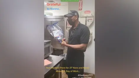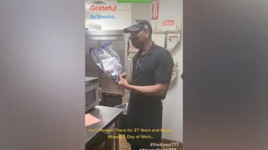 Kevin Ford trabaja en un local de Burger King en un aeropuerto de Las Vegas. Un usuario de Twitter compartió el video donde Ford muestra sus obsequios: la entrada de cine, dulces, dos plumas y un vaso de cristal. "La recompensa que mi trabajo me dio por 27 años . Nunca falté… Gracias", dice, visiblemente decepcionado.