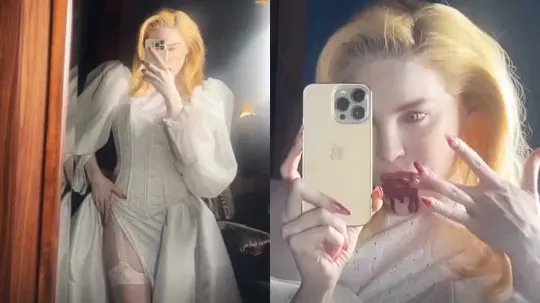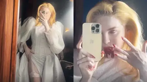 La intérprete de "La mala" usó un vestido clásico de novia, con corset integrado y con una caída que dejaba al descubierto una de sus piernas, enfundadas en medias con ligueros, también usó un velo y un maquillaje que simulaba que tenía colmillos, salpicados con la sangre que, presuntamente, acaba de beber.