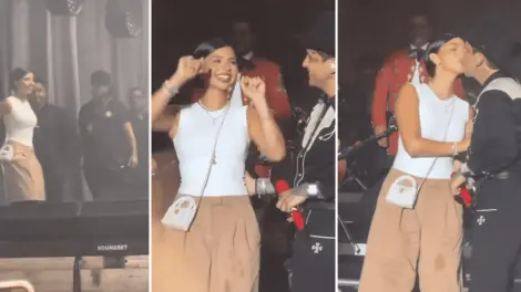 Con el micrófono en mano, Nodal llamó a Ángela Aguilar, quien se encontraba tras bambalinas. "Señora esposa, ¿quiere salir a saludar?", le dijo el cantante. Aguilar, con una sonrisa radiante, accedió y salió al escenario para saludar a los presentes. La interacción culminó con un beso entre los recién casados, que capturó la atención de todos.