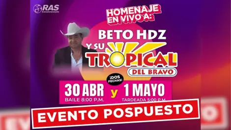 El mensaje precisa que, debido a causas de fuerza mayor, se ha reagendado la presentación: “Lamentamos comunicarles que por causas de fuerza mayor nos vemos en la necesidad de reagendar las fechas programadas para la presentación de Beto Hernández y su Tropical del Bravo y grupos invitados, que se llevarían a cabo los días 30 de abril y 01 de mayo del presente”, informaron.
