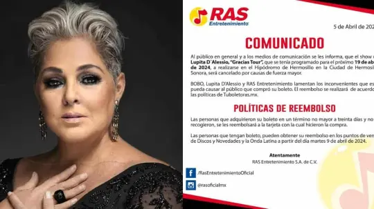 “BOBO, Lupita D’Alessio y Ras Entretenimiento lamentan los inconvenientes que esto puede causar al público que compró su boleto”, cita el comunicado.
