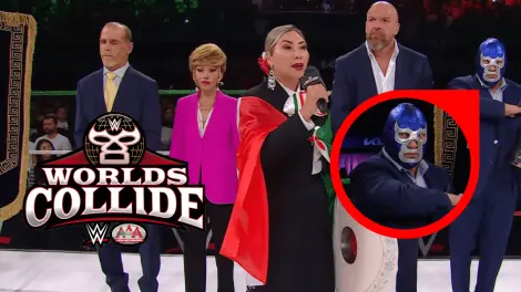 Además de Blue Demon Jr., en el ring estaban ejecutivos como Paul Levesque (Triple H), Shawn Michaels y Marisela Peña, presidenta de AAA, quien asistió con las cenizas de su hermano Antonio Peña, fundador de la empresa mexicana, como es costumbre en eventos conmemorativos.