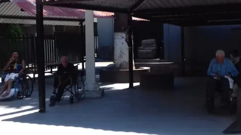 Sentados bajo la sombra de las techumbres en el patio, algunos echándose aire con una gorra o pedazo de cartón es como pasan parte de la mañana las personas que viven en el albergue, quienes les gusta salir para distraerse, pero que luego los meten nuevamente al edificio para cuidar su salud al intensificarse el calor y la humedad.