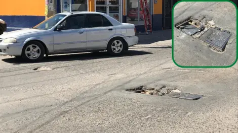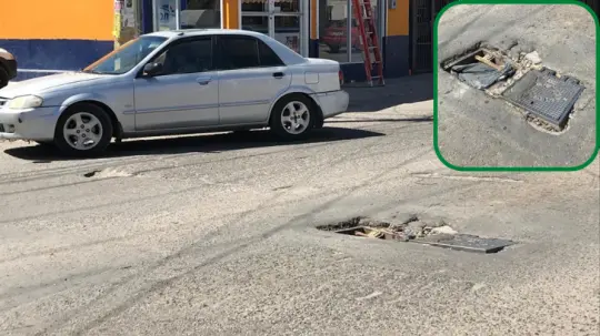 Vecinos de la colonia Villa del Real están propensos a múltiples accidentes automovilísticos al tener una alcantarilla destapada que ha propiciado un bache en una vialidad.
