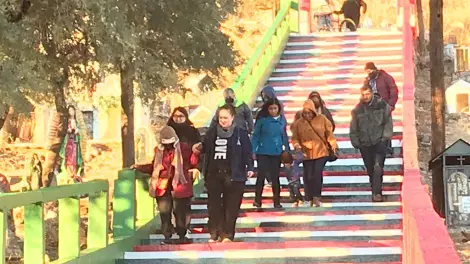 Peregrinos de diferentes puntos de Hermosillo caminan rumbo al Cerro de la Virgen en vísperas de su festejo a 10°C y llegan al cerro después de una larga caminata para subir 170 escalones y rezarle a la Virgen.
