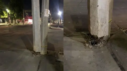 HERMOSILLO, SON.- Con un inminente peligro se hallan los transeúntes y automovilistas al pasar por un poste de luz, donde la base se encuentra sostenida con varillas de acero oxidadas, y el concreto completamente destrozado.