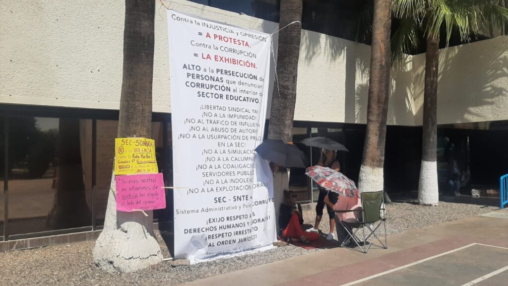 HERMOSILLO, SON.- La maestra Martha Elba González Pérez se encadenó a las afueras de las instalaciones de la Secretaría de Educación y Cultura desde las 11:00 horas de este jueves, denunciando abuso de autoridad por parte de las autoridades de la Secundaria General #2 Cajeme y de la misma SEC.