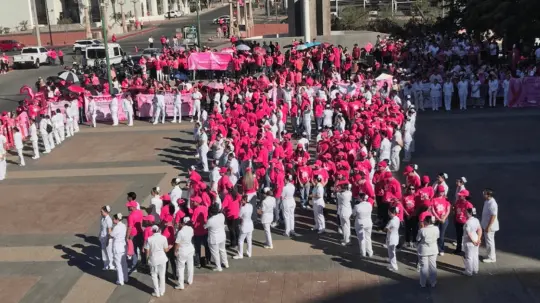 “Al llegar a la plaza de la bandera una paciente compartió su experiencia personal en la lucha contra el cáncer, habló sobre la importancia de la autoexploración y la detección de esta enfermedad en sus primeras etapas, además las enfermeras de IMSS Bienestar hicieron un moño humano rosa”.
