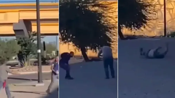 El hombre mayor persigue al joven alrededor del lugar e intenta agredirlo; en respuesta, el joven lanza una piedra que impacta en la cabeza del señor, quien cae inconsciente.