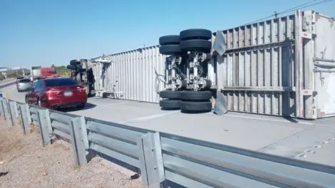 Un vehículo de carga pesada volcó sobre su costado derecho en el tramo carretero Hermosillo-Nogales, ocasionando que la circulación se cerrara parcialmente.