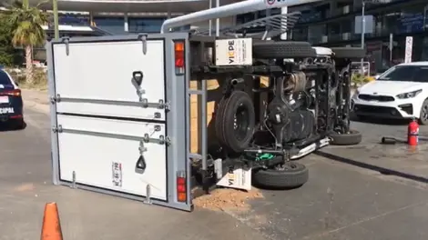 El conductor de un vehículo de carga no calculó correctamente la altura de la entrada a una plaza comercial, lo que provocó que se volcara.