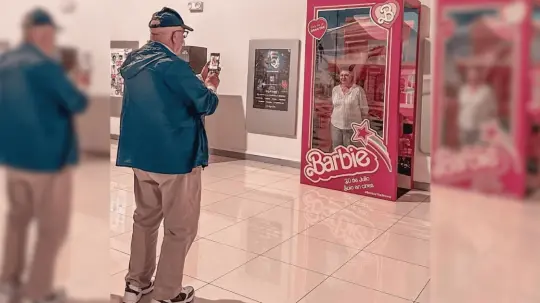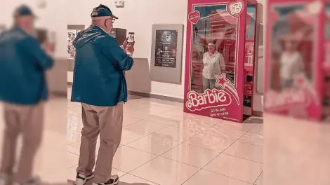 Se trata de una fotografía que captura el momento en que un hombre de la tercera edad le toma una foto a una mujer, quien se dice que es su esposa, mientras ésta posa dentro de la clásica caja rosa de la muñeca Barbie, la cual se ha instalado en los cines como parte del estreno del filme.