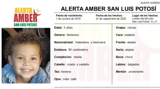 Autoridades de la Fiscalía General del Estado (FGE) activaron una Alerta Amber para la pronta localización de Vanessa Broekhuijsen Martínez, una niña de 3 años de edad, que fue vista por última vez en la capital potosina.