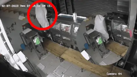 En una grabación de videovigilancia se ve como un individuo con una sábana encima logra escabullirse al interior de una carnicería, donde se le buscando algo.