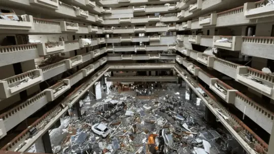 A pesar de que por fuera del hotel se observan palmeras caídas, la estructura del hotel sólo presenta daños leves.