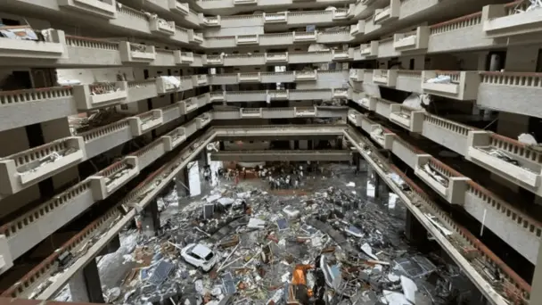 En otro video captado en el mismo hotel, se observa parte de la recepción, en donde se aprecian algunos vehículos, en medio de escombros. Además, un auto se metió al lobby.