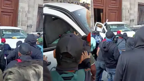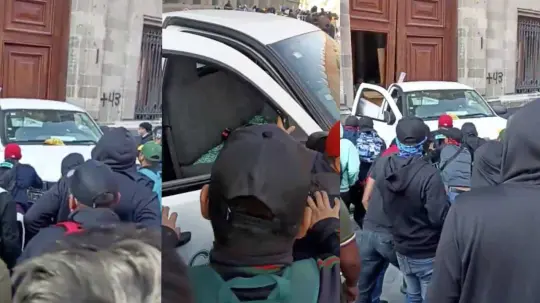 Los jóvenes, con gorras y el rostro cubierto con cubre bocas, usaron una camioneta de la CFE como ariete para derribar la puerta de madera de Moneda número 1.