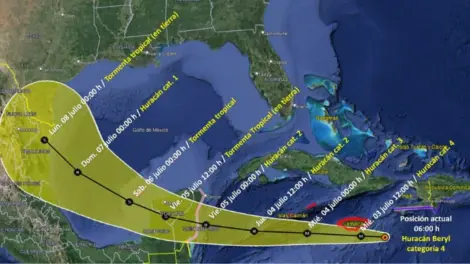 El huracán 'Beryl' se mantiene en la categoría 4, con vientos máximos sostenidos de 230 km/h y rachas de hasta 280 km/h. Aunque actualmente el sistema no afecta las costas nacionales, su localización a 125 km al sureste de Kingston, Jamaica, y a 1,215 km al este-sureste de Cancún, indica un posible ingreso a tierra por el estado de Quintana Roo.