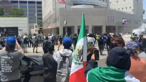 Los asistentes se dispersaron brevemente frente al Centro de Detención Metropolitano en el centro de Los Ángeles después de que las autoridades desplegaran lo que parecía ser gas lacrimógeno; sin embargo, se unieron a una multitud que se reunió hoy desde temprano afuera del edificio federal, que estaba custodiado por miembros de la Guardia Nacional.