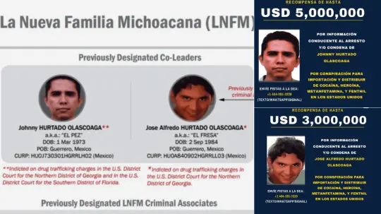 Estados Unidos emitió nuevas sanciones y anunció recompensas millonarias por información que conduzca al arresto de los hermanos Johnny y José Alfredo Hurtado Olascoaga, alias 'El Pez' y 'El Fresa', líderes del cártel La Nueva Familia Michoacana (LNFM), una organización criminal mexicana recientemente designada como Organización Terrorista Extranjera (FTO, por sus siglas en inglés).
