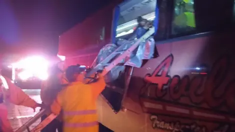 La parte frontal del autobús de pasaje sufrió severos daños y quedó cubierto de la sangre del animal que terminó incrustado en la parte del piloto, por lo que solicitaron apoyo de la empresa para trasladar a las personas en otro autobús, a fin de que cada uno continuara su camino a sus destinos.