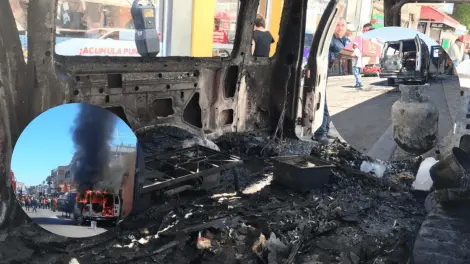 Al interior de esta camioneta se encontraba un tanque de gas que era utilizado para calentar la carne de una taquería; una fuga en la manguera de la misma provocó la explosión e incendio.
