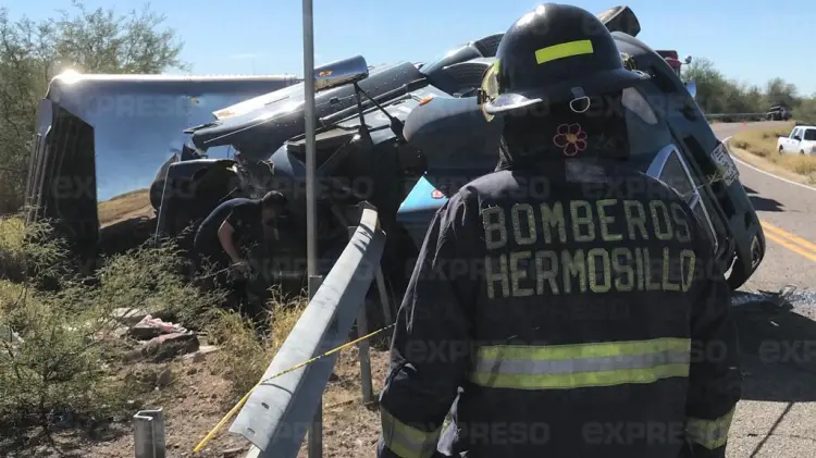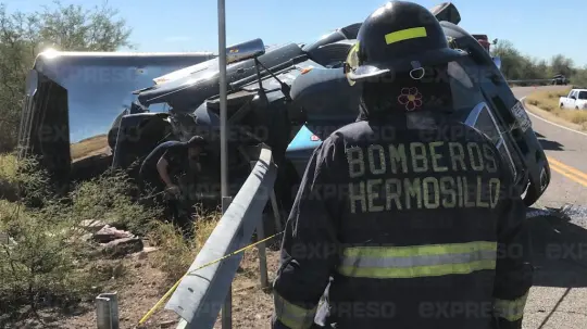 Mueren dos personas al volcarse tractocamión en carretera Ures-Hermosillo