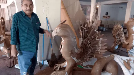 “Ahorita estoy haciendo un grifo, un animal mitológico griega que es mitad águila y mitad león, pero como este es un Carnaval del Mar de Cortés le pusimos cola de pescado, van a ser ocho grifos, cinco caballitos de mar y donde va la reina, que es a una altura de 2.50 metros va a ir una figura del cerro Tetakawi y a los lados de ella va a llevar seis tritones”, detalló.