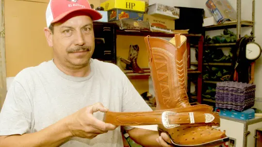 Manuel tiene la habilidad de fabricar botas de distintas pieles que van desde avestruz, lagarto, mula y hasta de materiales exóticos como armadillo y mantarraya.