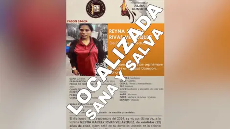 La madrugada de este sábado 21 de septiembre de 2024, la Fiscalía General de Justicia del Estado de Sonora (FGJE) confirmó la localización de Reyna Karely Rivas Velázquez, de 22 años, quien había sido reportada como desaparecida el pasado 16 de septiembre.