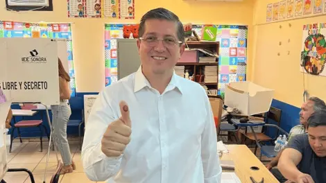 Jorge Alberto Elías Retes, candidato a la alcaldía de Navojoa, emitió su voto al filo del mediodía, acompañado por su esposa Luz Argel Gaxiola de Elías y sus dos hijos, en la casilla electoral de la Escuela Primaria Estatal 'Juventino R. Solano', en Pueblo Viejo.