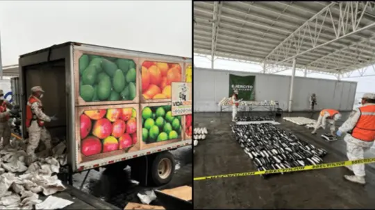 Entre lo decomisado están 573 mil 740 dosis de posible metanfetamina, con un peso aproximado de 573 kilogramos; 714 mil 975 pastillas de probable fentanilo, con un peso aproximado de 77 kilogramos y mil 390 dosis de posible goma de opio, con un peso aproximado de un kilogramo.