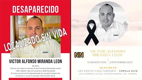 La noche del domingo fue localizado sin vida Víctor Alfonso Miranda León, conductor de la aplicación Uber que se encontraba desaparecido desde el pasado 31 de octubre. Se reporta que su cuerpo fue hallado dentro de su automóvil en un área ubicada detrás del cine Cinemex, en Navojoa.
