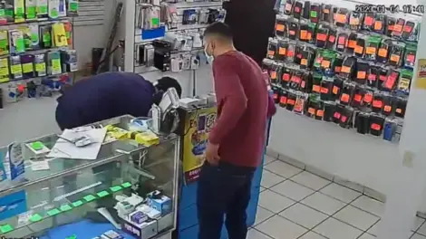Según el video captado por la cámara de vigilancia, el asalto se registró el pasado 4 de enero poco antes de las 6 de la tarde, donde un sujeto con camiseta azul manga larga, gorra negra y cubrebocas ingresó para pedir que le muestren unos accesorios de celular.