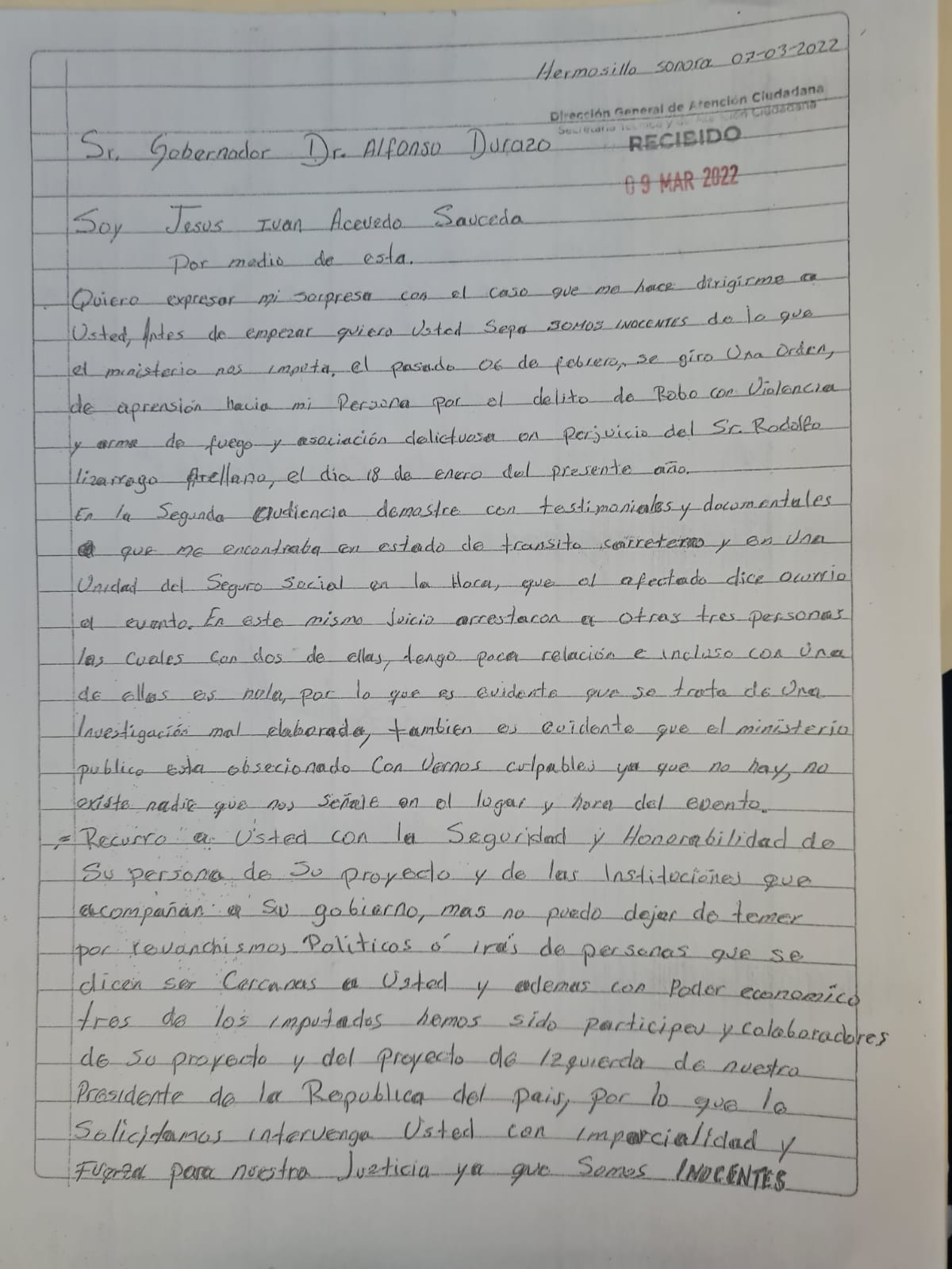 GUAYMAS, SON.- El regidor del Ayuntamiento de Guaymas, Iván Acevedo Sauceda, quien se encuentra preso en el Centro de Reinserción Social (Cereso) de Hermosillo, envió una carta al gobernador Alfonso Durazo Montaño para solicitarle que intervenga en su caso, ya que asegura que es inocente de los delitos que se le imputan.