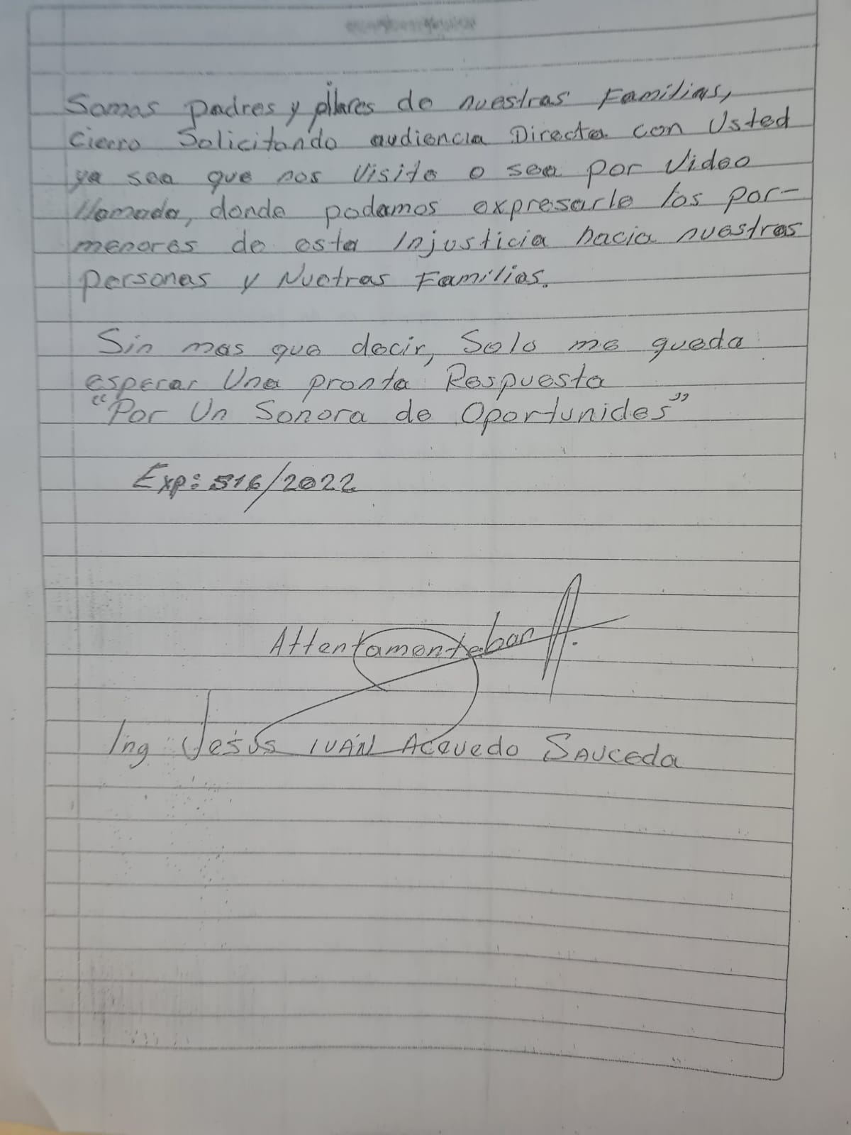 Pidió también sostener una audiencia directa con Durazo Montaño, ya sea mediante una visita del mandatario al Cereso o por videollamada, donde él y los otros tres imputados le puedan explicar “los pormenores de esta injusticia hacia nuestras personas y nuestras familias”.